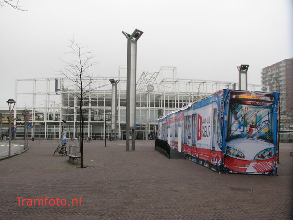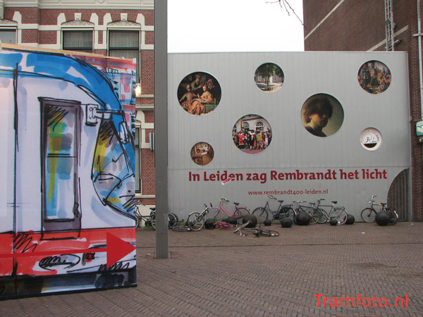Voor het station van Leiden stond een houten kist in de vorm van een tram. In de tram kon informatie worden vergaard over de plannen van de aanleg van de Rijn-Gouwelijn door het centrum van Leiden.